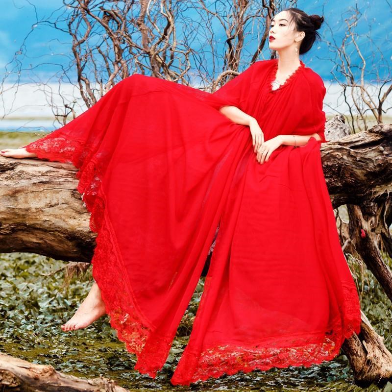 茶卡盐湖仙复古红裙开衫斗篷连衣裙西藏沙漠旅拍红色披风长裙热门设计联盟服务商