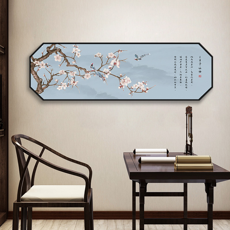 新中式客厅装饰画沙发后背景墙画横幅八边形梅花鸟大气卧室床头画热门设计联盟服务商