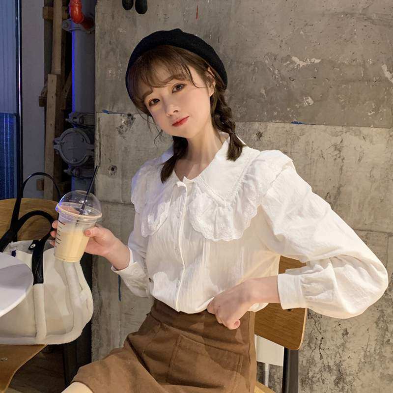 白色长袖娃娃领衬衫女设计感小众2020新款春秋季宽松甜美减龄上衣热门设计联盟服务商